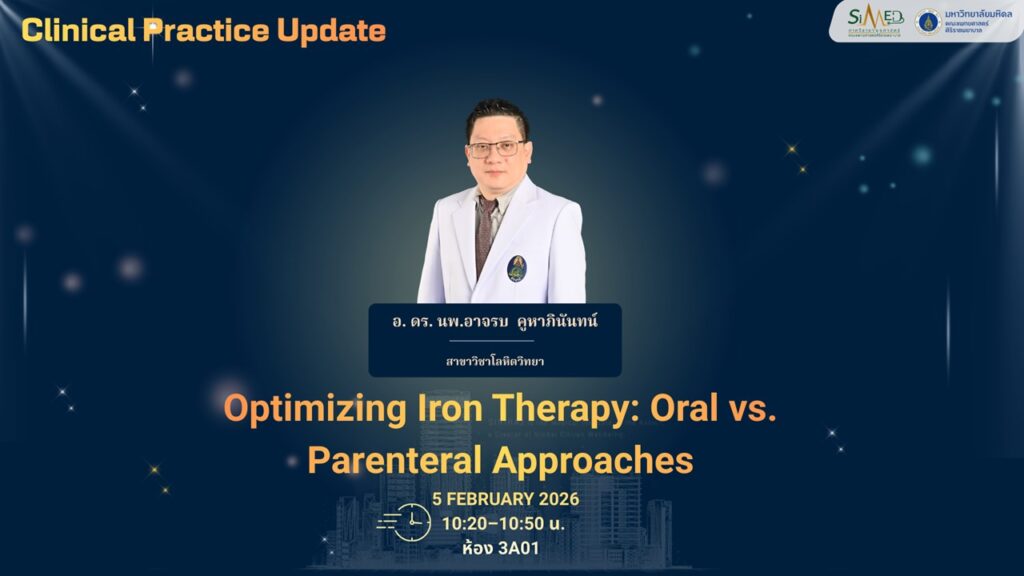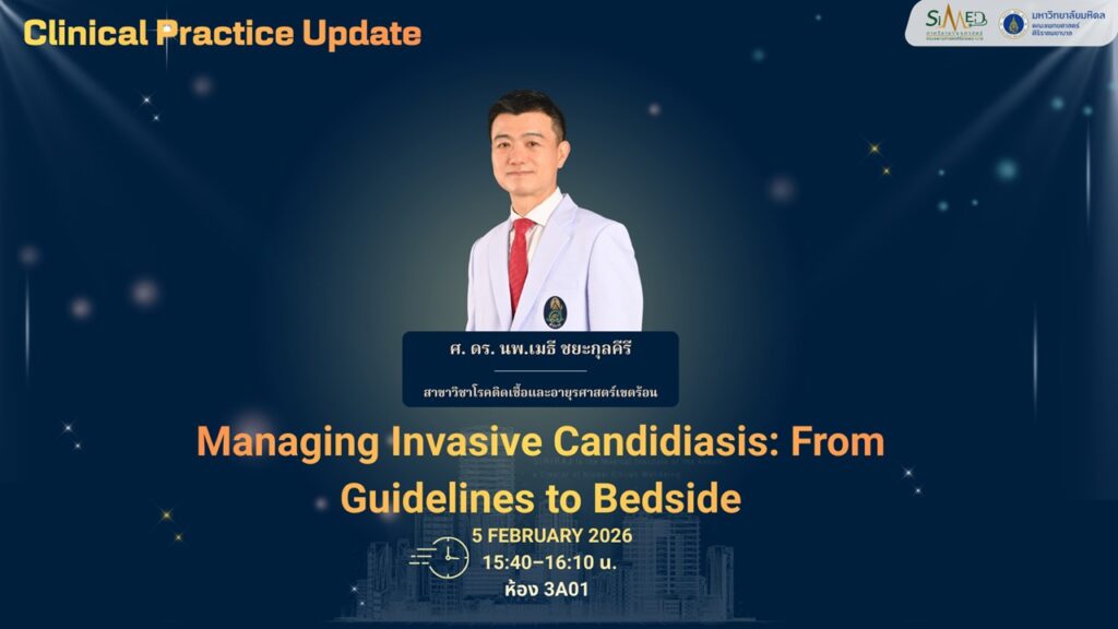 Siriraj Medicine Conference 2026: Evolving Standards, Smarter Care Handout * วิดีโอและเอกสารประกอบการบรรยาย (เฉพาะหัวข้อที่วิทยากรยินยอมให้เผยแพร่เท่านั้น) ** สำหรับท่านที่รับชมผ่าน Ipad/Tablet ให้วางอุปกรณ์ของท่านเป็นแนวตั้งจึงจะสามารถรับชมวิดีโอได้ วันที่ 5 ก.พ. 69 (ห้อง 3A01) ห้องราชปนัดดา ห้อง 3A01 วันที่ 3 ก.พ. 69 วันที่ 4 ก.พ. 69 วันที่ 5 ก.พ. 69 วันที่ 6 ก.พ. 69 หัวข้อการประชุม คลิกเพื่อรับชมวิดีโอ คลิกเพื่อรับชมวิดีโอ คลิกเพื่อรับชมวิดีโอ Views: 134